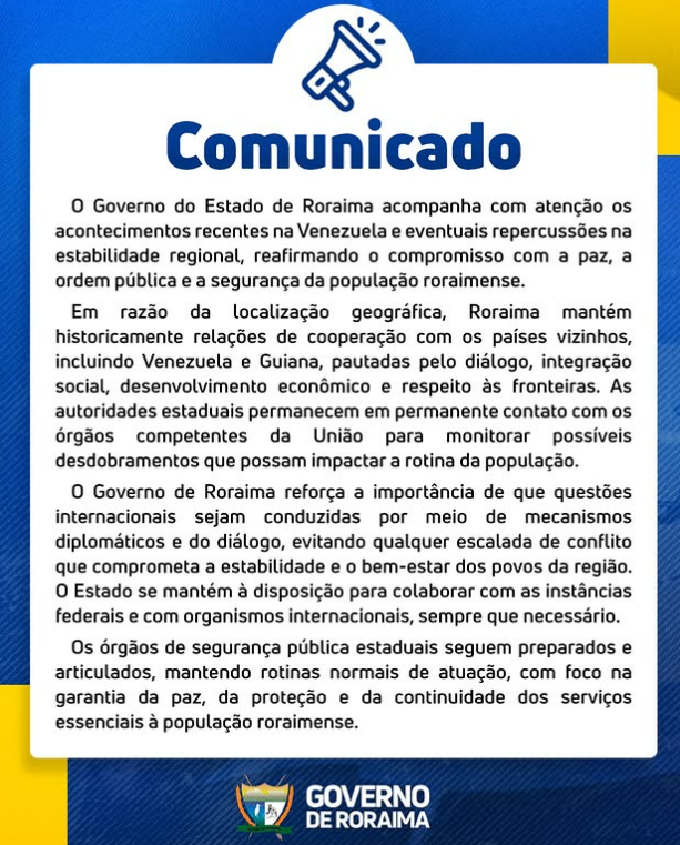 Em nota oficial, o governo de Roraima informou que acompanha com atenção os acontecimentos recentes na Venezuela e eventuais repercussões na estabilidade regional, reafirmando o compromisso com a paz, a ordem pública e a segurança da população. O comunicado destaca ainda que, em razão da localização geográfica, o estado mantém relações históricas de cooperação com países vizinhos, como Venezuela e Guiana, e que há contato permanente com órgãos da União para monitorar possíveis desdobramentos.