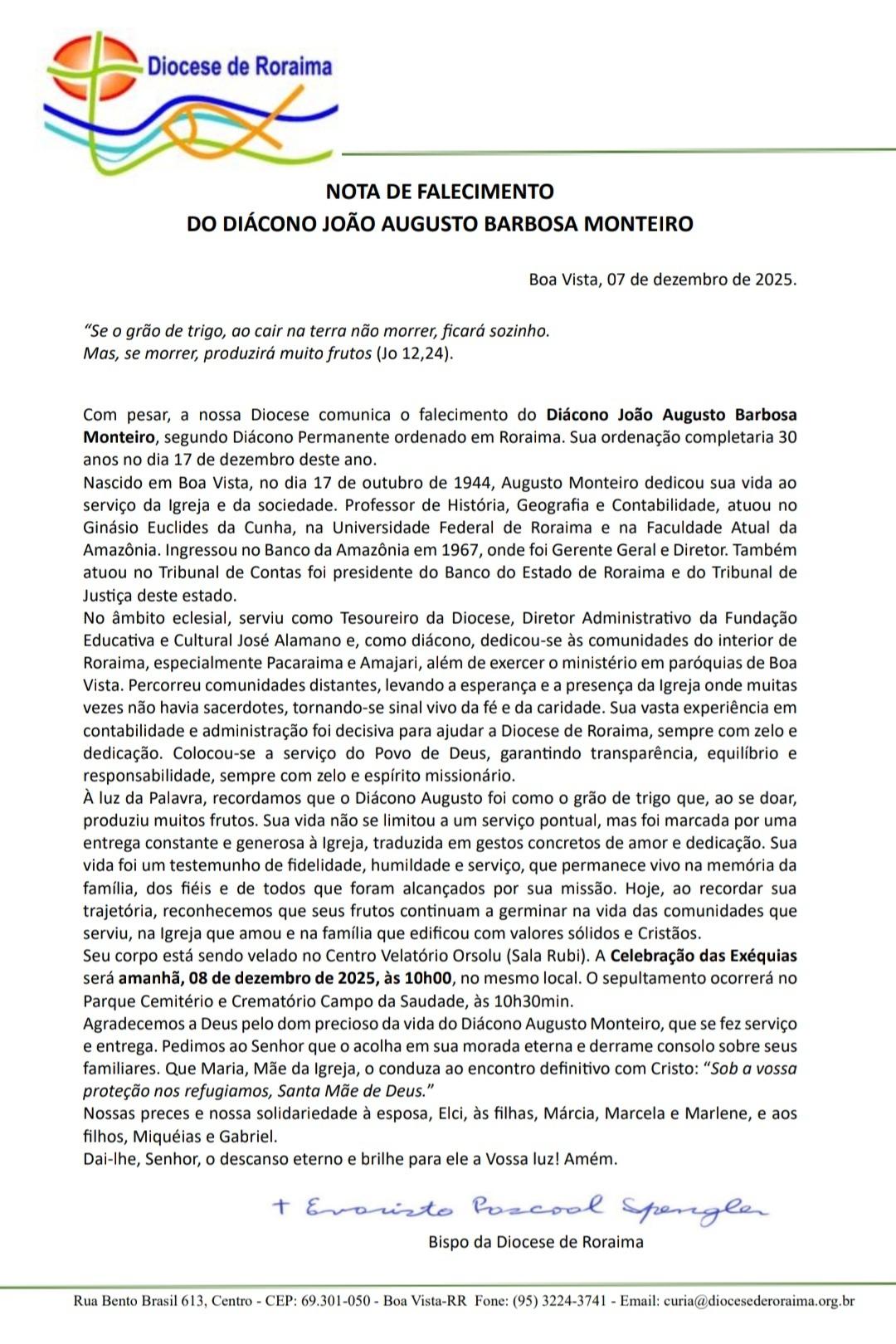 A Diocese de Roraima comunicou com grande pesar, o falecimento do diácono permanente João Augusto Barbosa Monteiro, aos 81 anos. Nascido em 17 de outubro de 1944, em Boa Vista, ele faleceu neste domingo 7 de dezembro de 2025. Figura muito respeitada na Igreja e na sociedade roraimense, o diácono dedicou mais de duas décadas de sua vida ao serviço evangelizador e administrativo da Diocese.