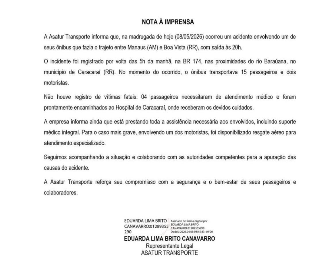 Ainda conforme informações da PRF, apesar do susto, o acidente não teve vítimas fatais. Quatro passageiros necessitaram de atendimento médico e foram prontamente encaminhados ao Hospital de Caracaraí, onde receberam os devidos cuidados.