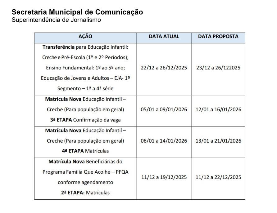 Também foram alteradas as datas da Matrícula Nova da Educação Infantil – Creche (população em geral). A 3ª etapa, referente à confirmação da vaga, foi remanejada de 5 a 9 de janeiro de 2026 para o período de 12 a 16 de janeiro de 2026. Já a 4ª etapa, destinada à efetivação das matrículas, passa de 6 a 14 de janeiro de 2026 para 13 a 21 de janeiro de 2026.
