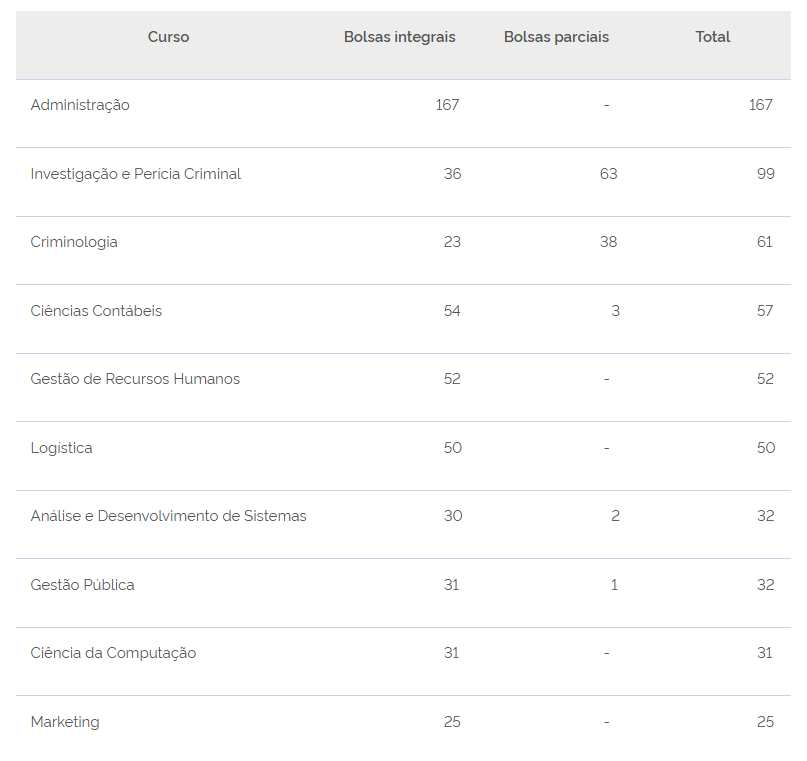 Cursos – O curso de graduação com o maior quantitativo de bolsas ofertadas no estado é administração, com 167 bolsas integrais. Depois dele, os dois cursos com mais ofertas são: investigação e perícia criminal, com 99 bolsas (36 integrais e 63 parciais) e criminologia, com 61 bolsas (23 integrais e 38 parciais). A maior parte da oferta na região é de bolsas integrais.